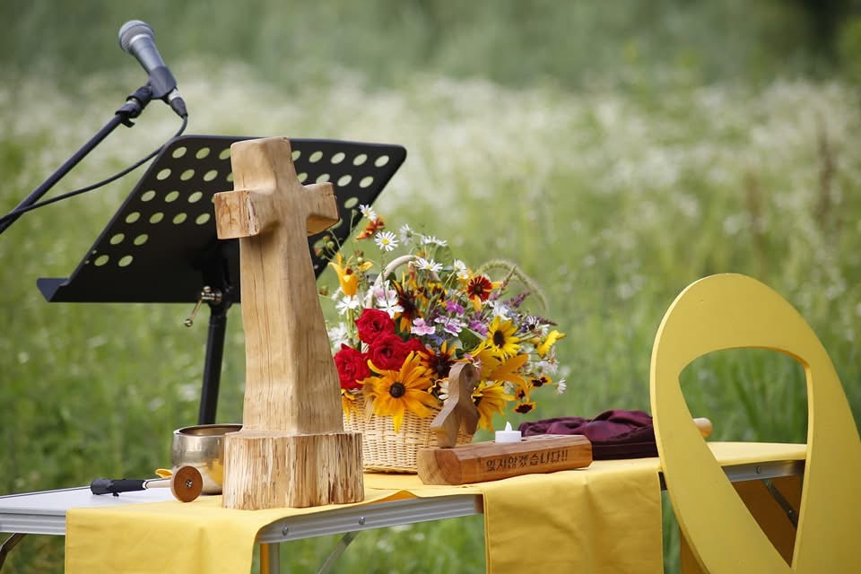 2018년 5월 첫 예배를 준비하며 수시로 변하는 날씨에, 가림막 하나 없는 이곳에, 과연 누가 예배를 드리러 올 까 걱정이 되었었다. 풀을 깎고 노란 의자를 깔고 테이블에 나무 십자가를 놓고 사람들을 기다리며 앉으니 저 멀리 단원고가 보였다. 그리고 그 앞으로 풀숲과 나무가 어우러진 4.16생명안전공원 부지가 보였다. 풍경만으로도 위로가 되었고 앞으로 세워질 4.16생명안전공원에 대한 희망도 생겼다. 그리고 사람들이 달이 바뀔수록 해가 넘어갈수록 점점 더 모이기 시작했다.