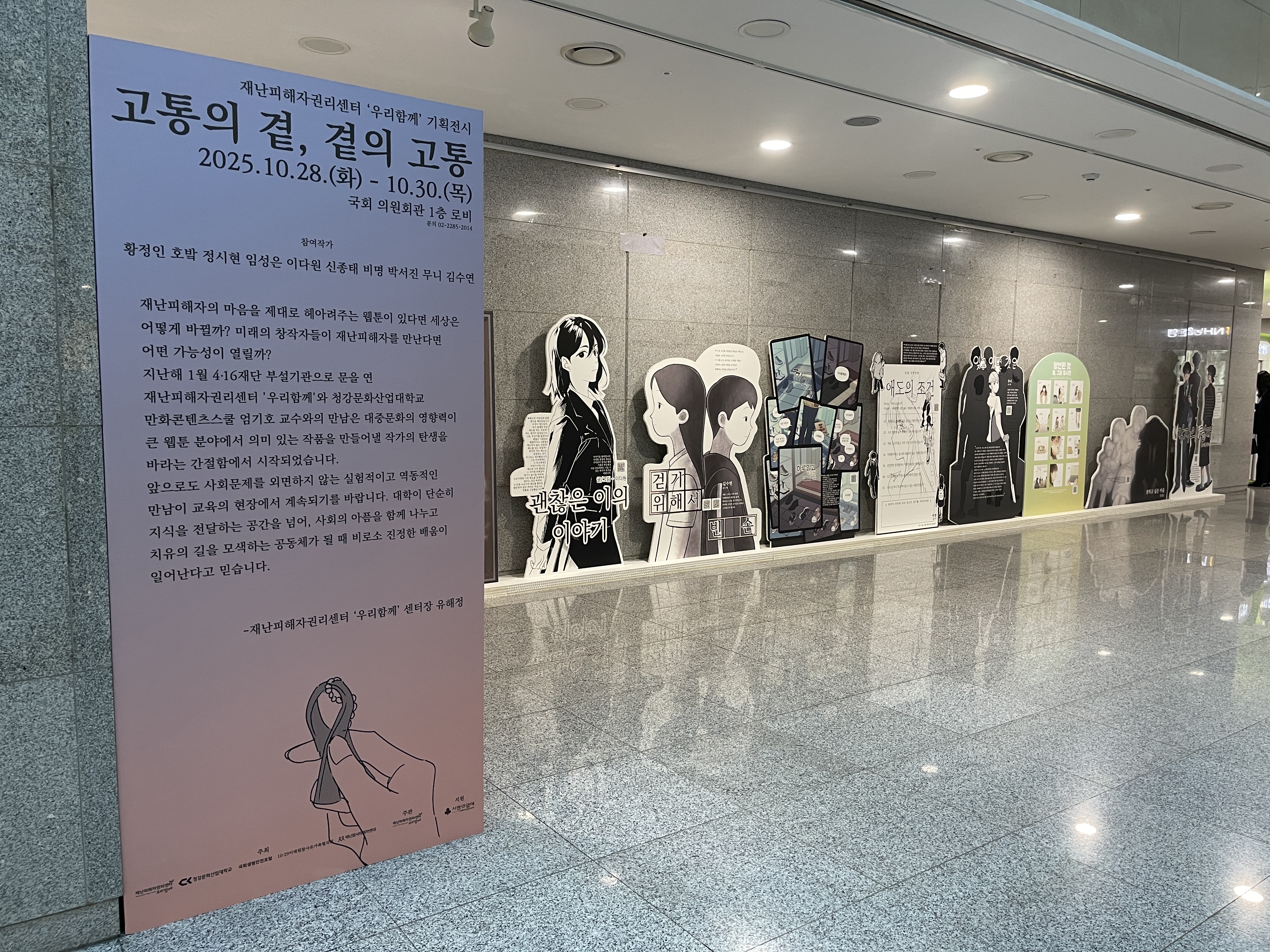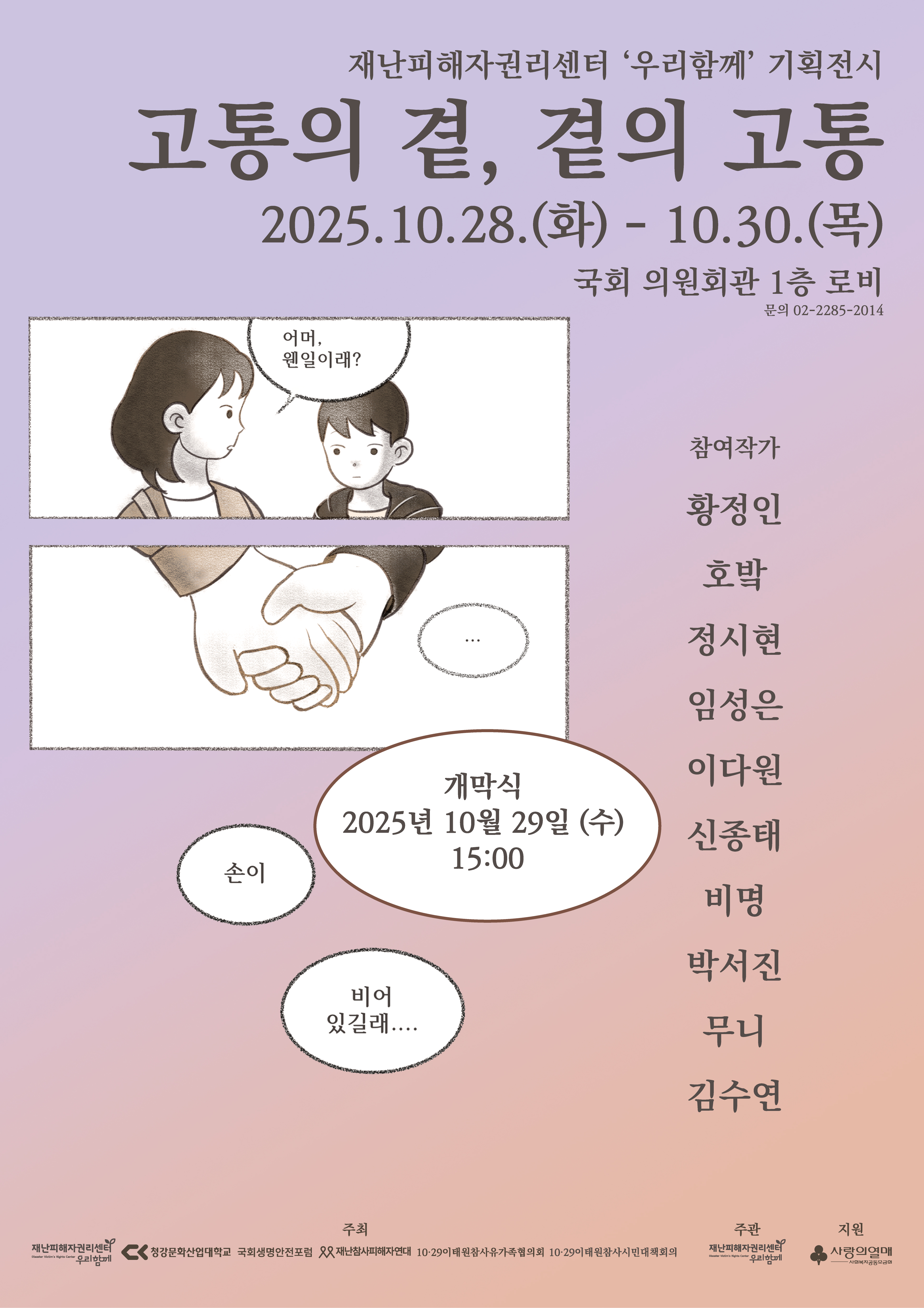 <고통의 곁, 곁의 고통>은 국회 전시를 시작하여, 경기도청(11.4~11.7) , 별들의 집(11.11~11.21), 수원시 평생학습관 /창룡도서관 (11월~12월), 광주광역시청(11.24~ 12.1)으로 순회 전시되며, 재난피해자권리센터‘우리함께’ 홈페이지에서도 만나보실 수 있습니다.(https://1661-2014.org/2025exhibition)