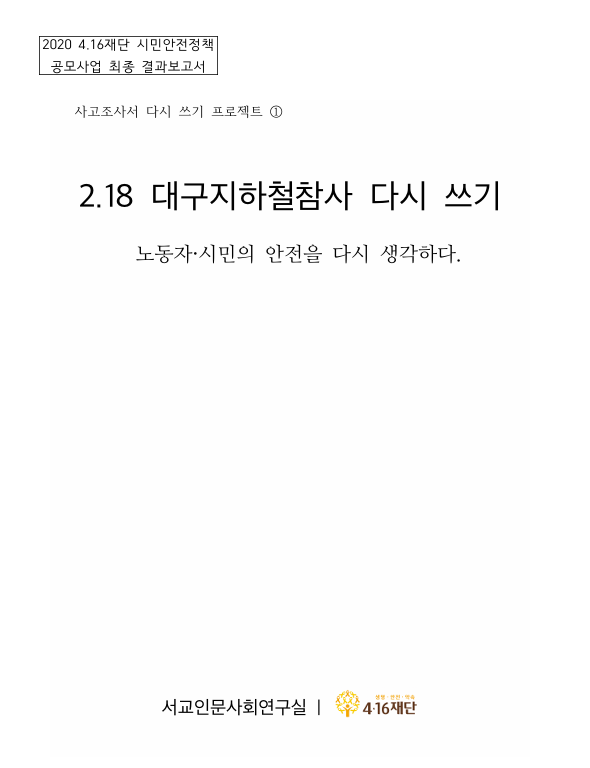 2.18대구지하철 화재 참사는 2003년 2월 18일 대구 중앙로역에서 발생한 화재로 최소 192명이 희생된 사건이다. 방화로 화재가 발생했으나 불쏘시개와 다를 바 없는 전동차 내장재, 1인 승무원제, 대구시와 대구지하철 공사의 미흡한 초기 대처가 피해와 고통을 키웠다. 현재까지도 희생자들의 추모 문제는 해결되지 않았다.