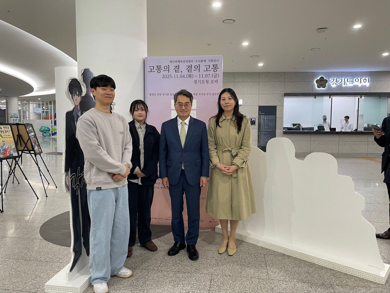 경기도청 전시 기간 동안 김동연 경기도지사가 전시장을 방문하여 작품을 전시한 청강문화산업대학교 학생들과 함께 전시를 관람하며, 재난피해자들의 고통과 그 곁을 지키는 이들의 이야기에 깊은 관심을 표명했습니다. 도지사는 학생 작가들의 진솔한 작품 세계를 격려하고, 재난피해자 권리 보호의 중요성을 강조했습니다.